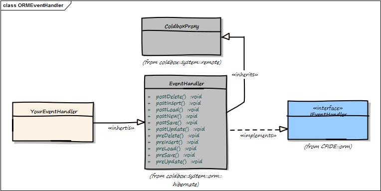 }That's it! Just by doing this the CF ORM will call your CFC's event methods in this CFC and satisfy the interface. Of course you can override the methods, but always remember to fire off the parent class methods in order for the ColdBox interceptions to still work. You can then override each event method as needed. Below is a chart of methods you can override: